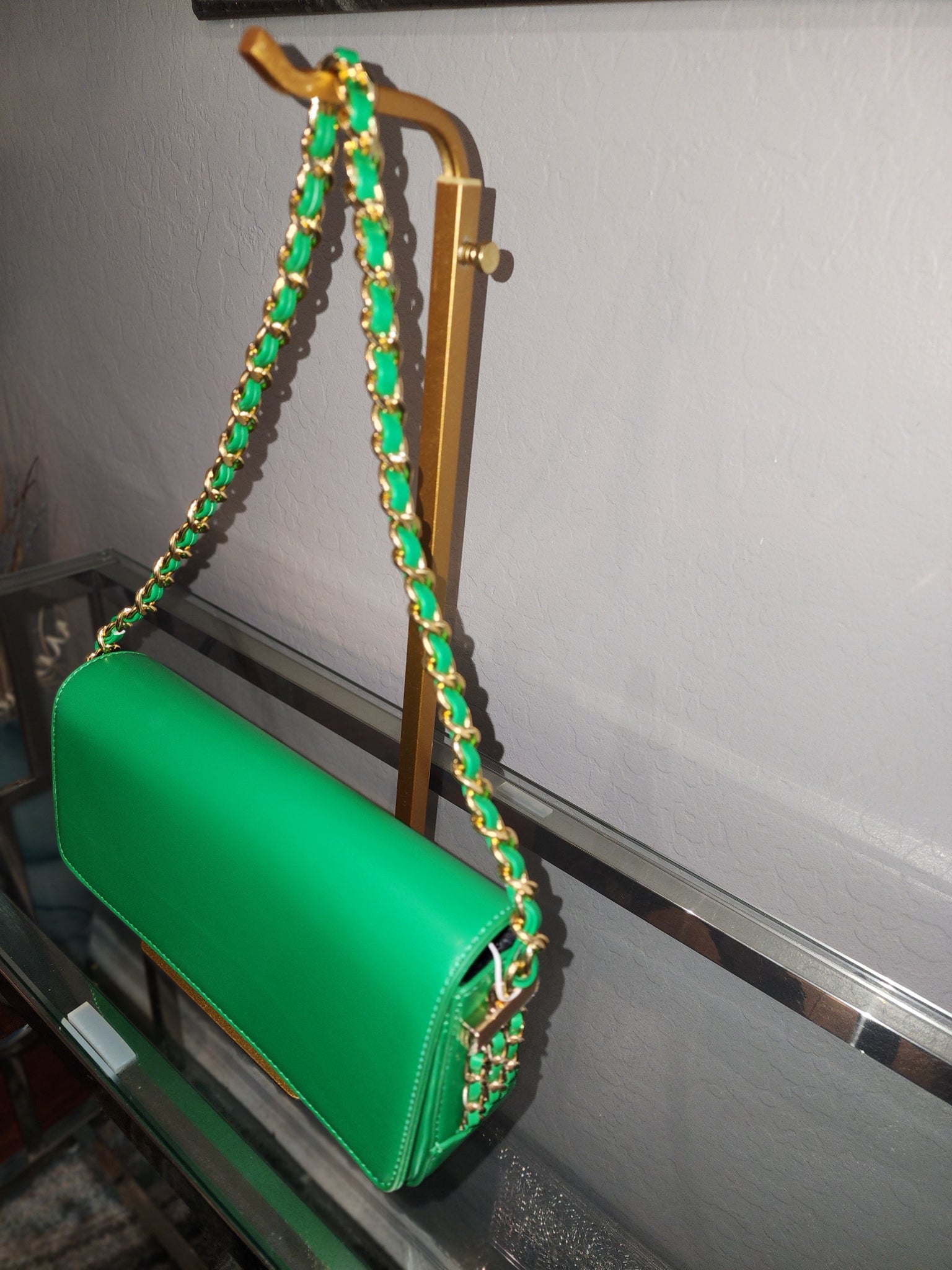 Refined and radiant, this green purse features elegant gold link handles for a touch of luxury. A timeless accessory that adds sophistication and poise to any ensemble.